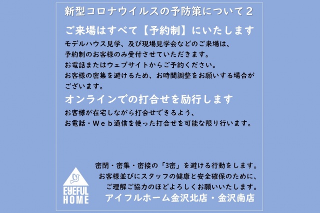 営業活動としての訪問活動、またお引渡し後の点検訪問を最小限とさせていただきます。