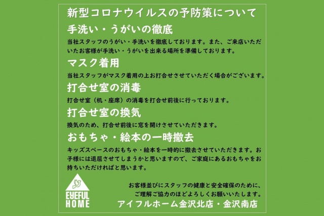 アイフルホーム金沢北店・金沢南店では、お客様に安心してご来店していただけるよう、以下の予防策を講じております。