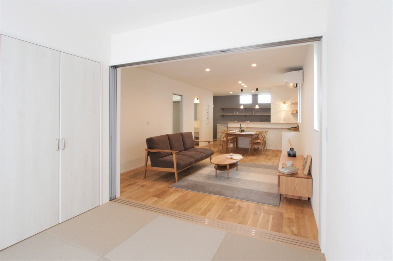 人が多くてリビングがちょっと狭いなと感じるような時には、和室を開け放ってリビングの続き間のように使えます。座卓を置けばここでお食事もしやすいですね。