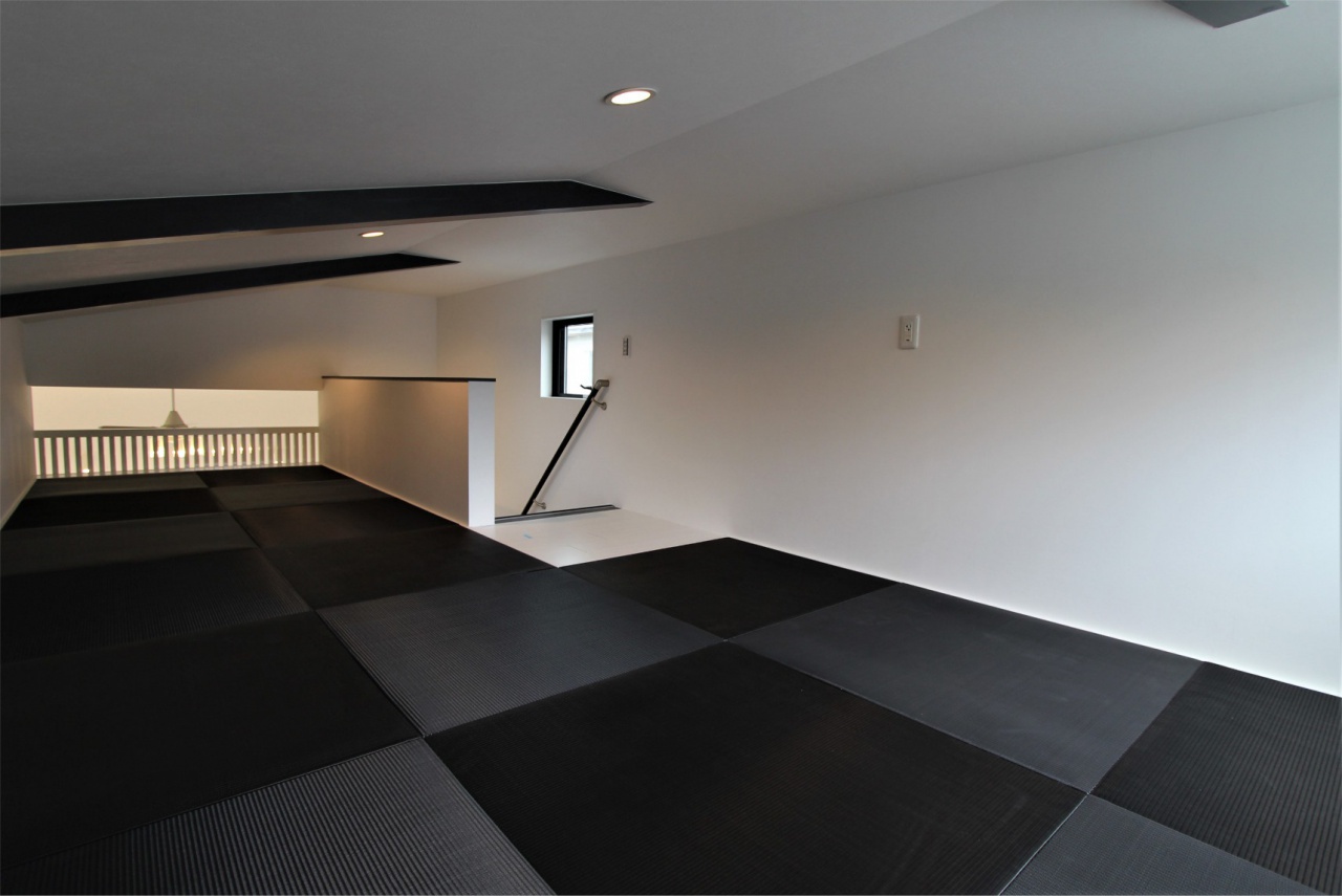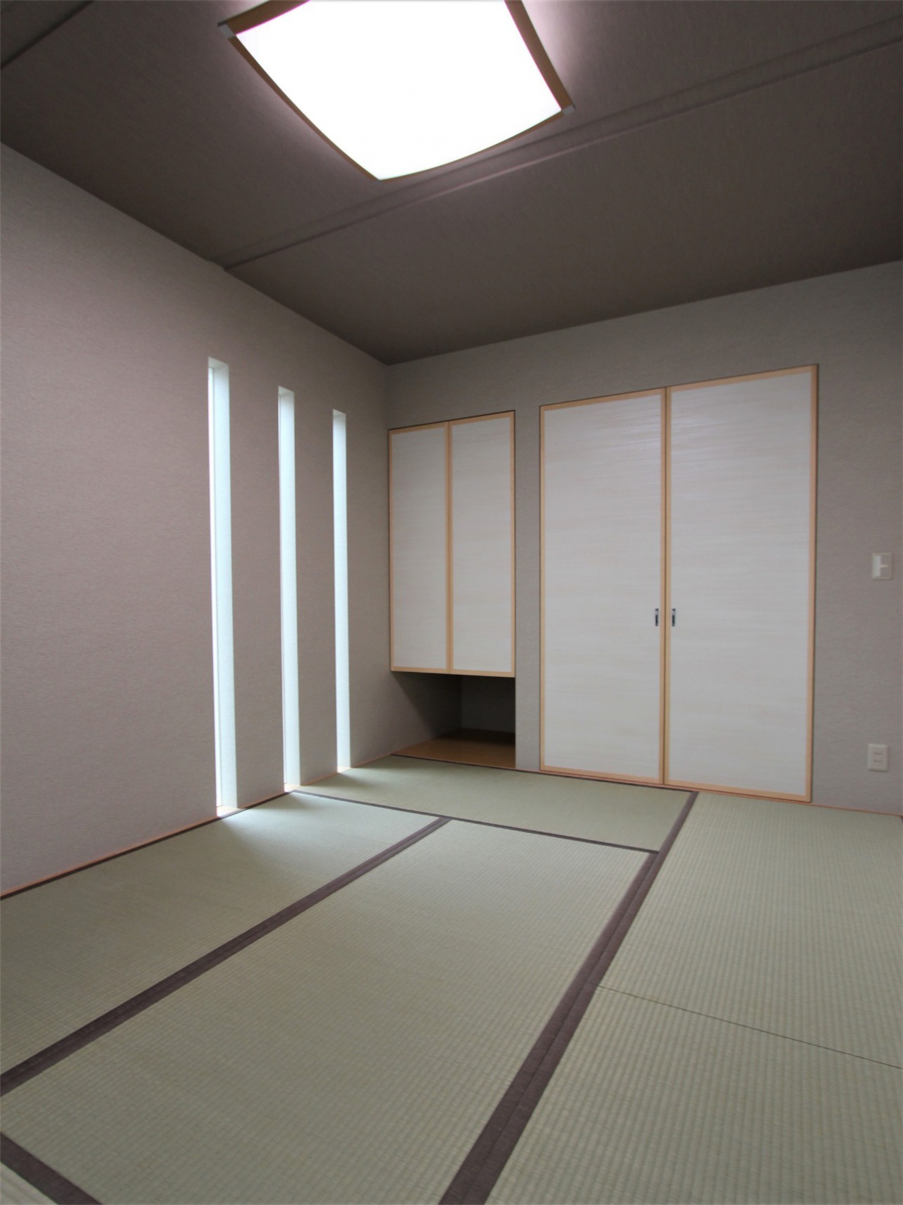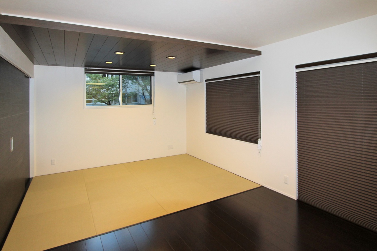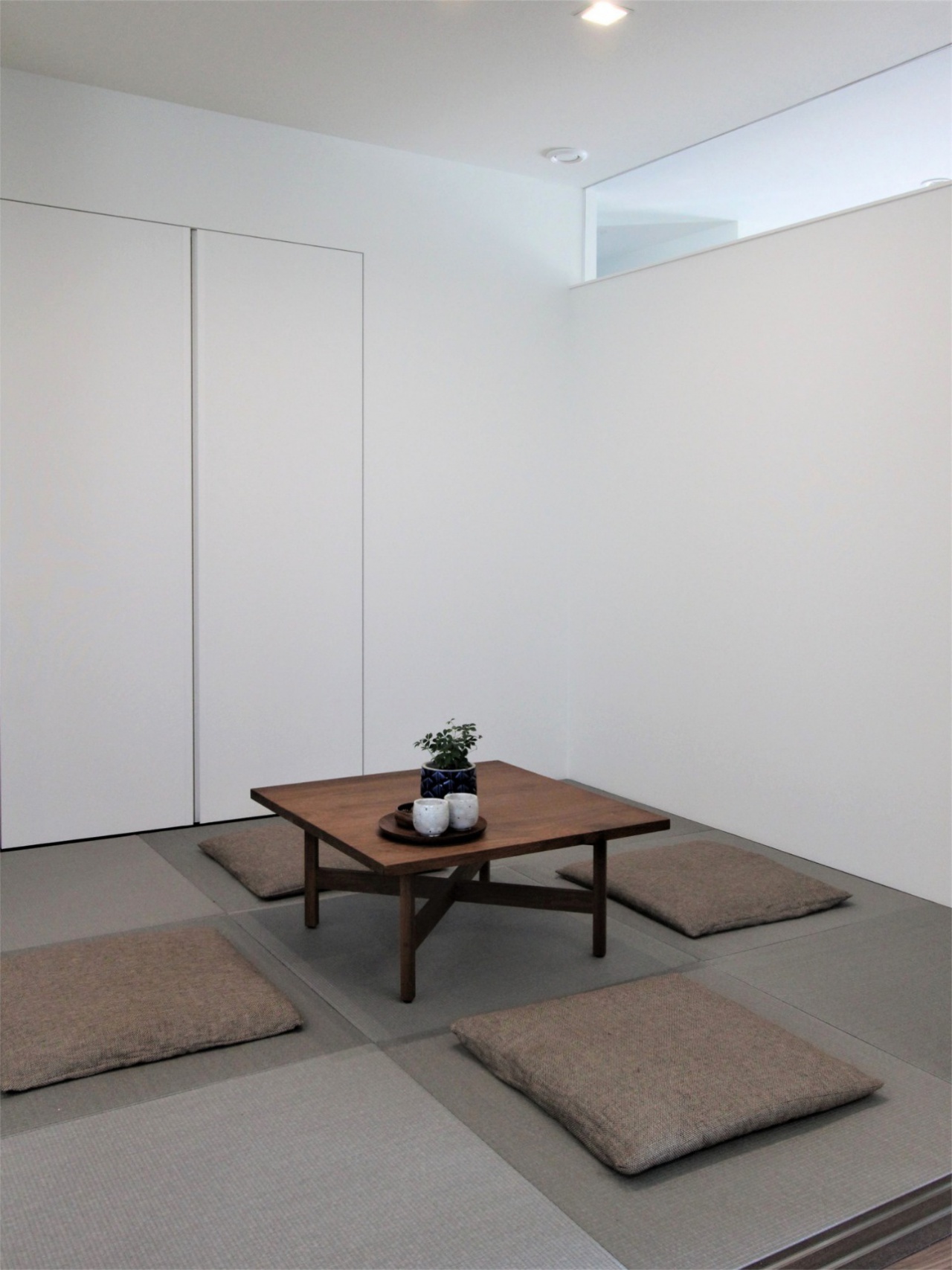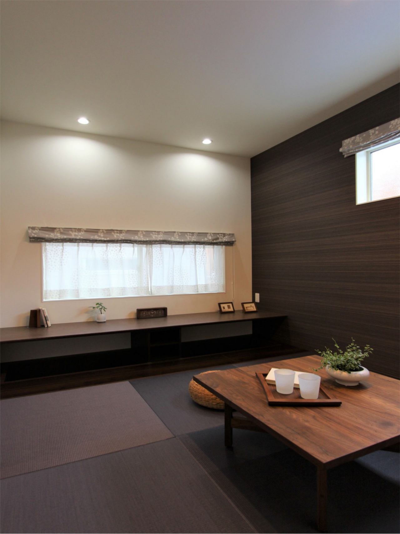 スリット窓がスタイリッシュなリビング隣接の小上がり畳コーナー。
