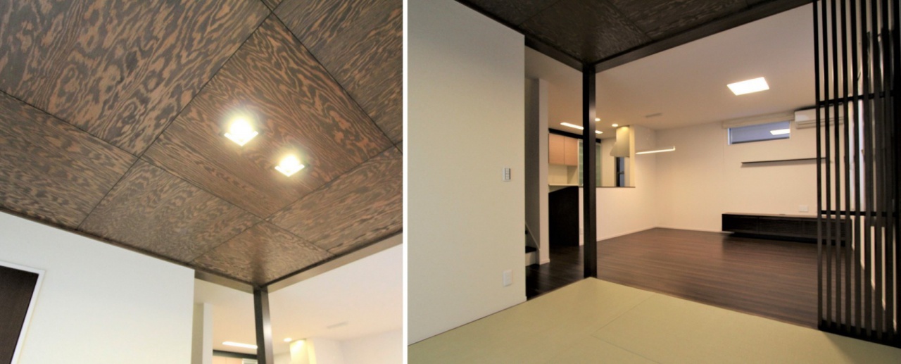仕切り上部をガラス張りにし、天井の板張りがリビングからつながって見える和室。