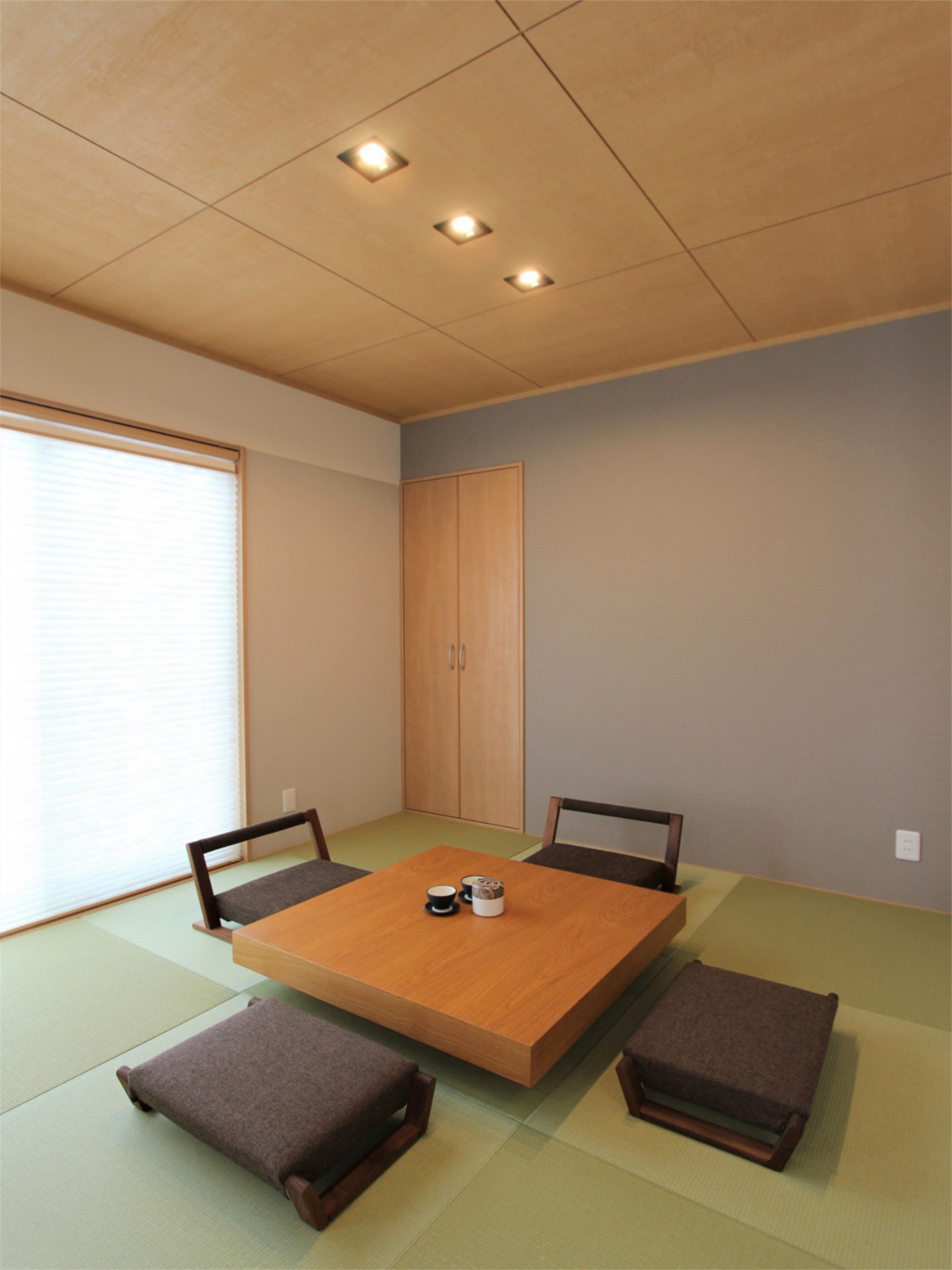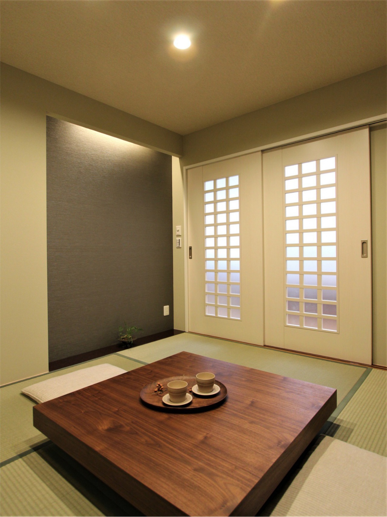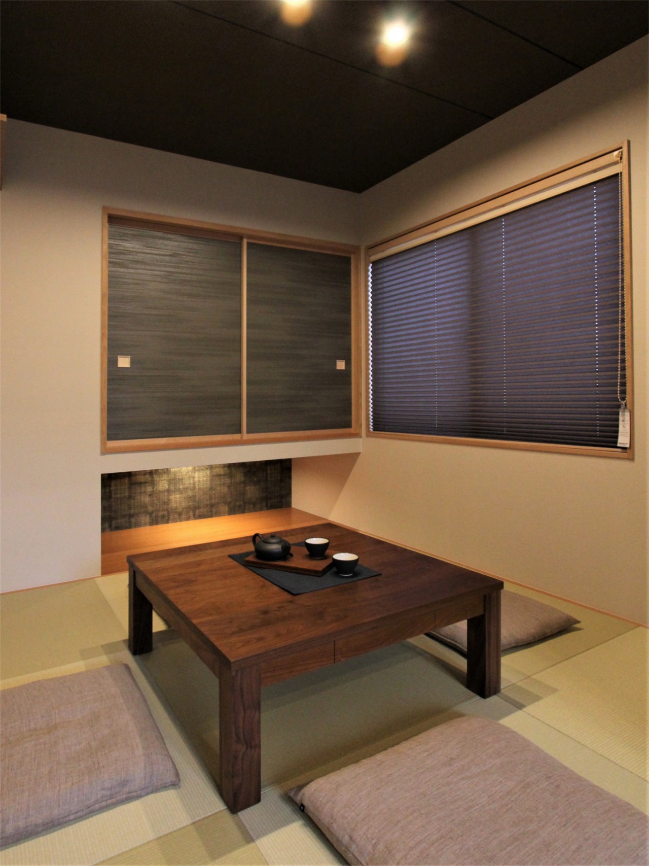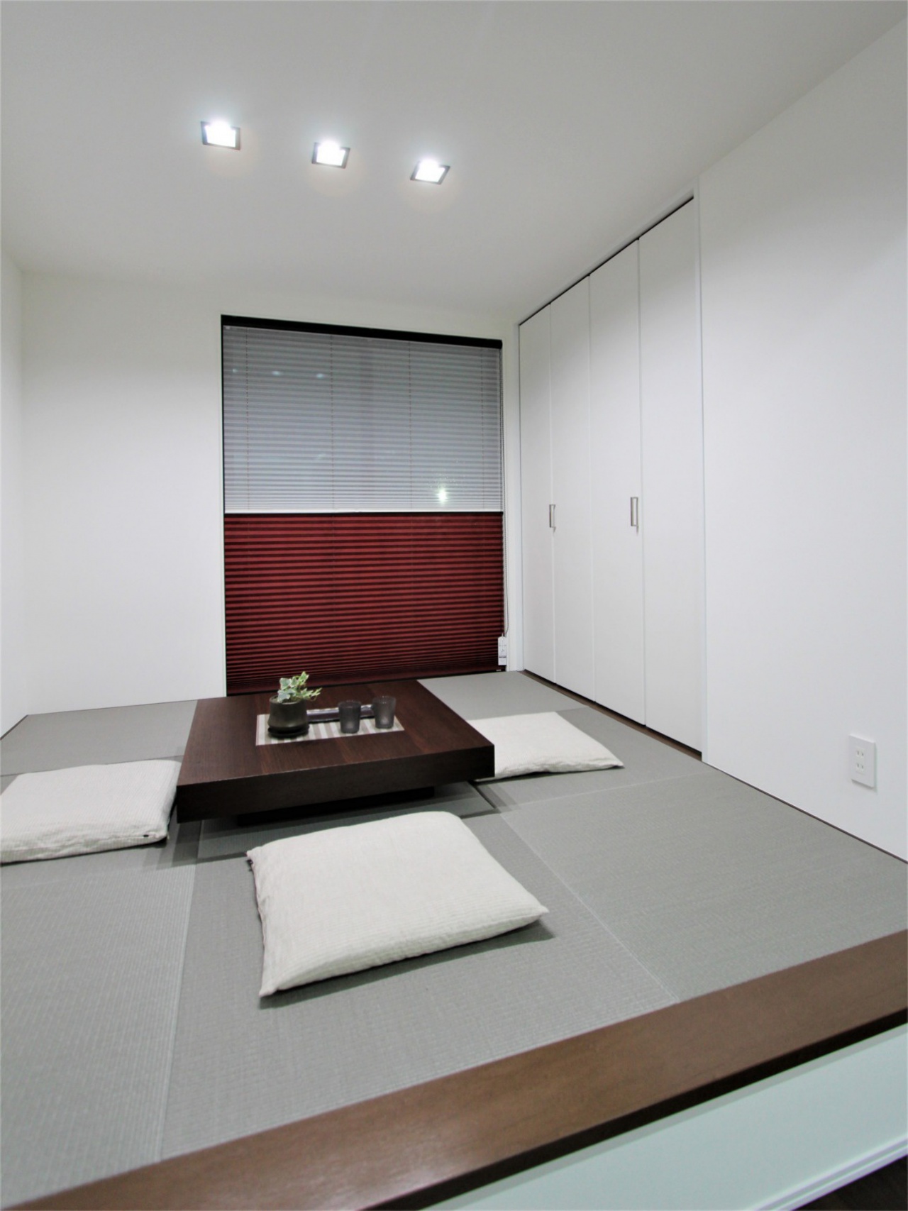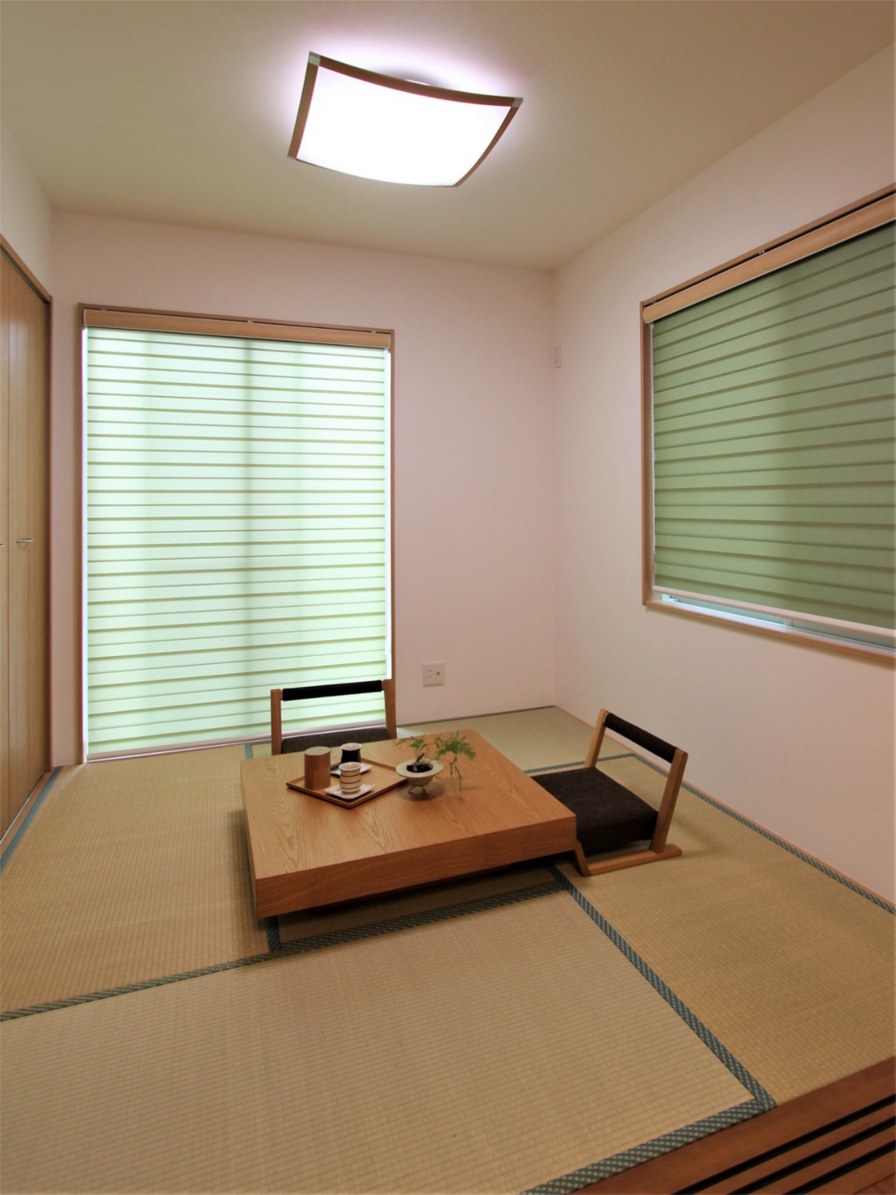 窓には透過度を調節できるプリーツスクリーンを使用。障子のような柔らかな光が心地よい空間です。照明をよく見ると畳配置と同じ柄になっています。