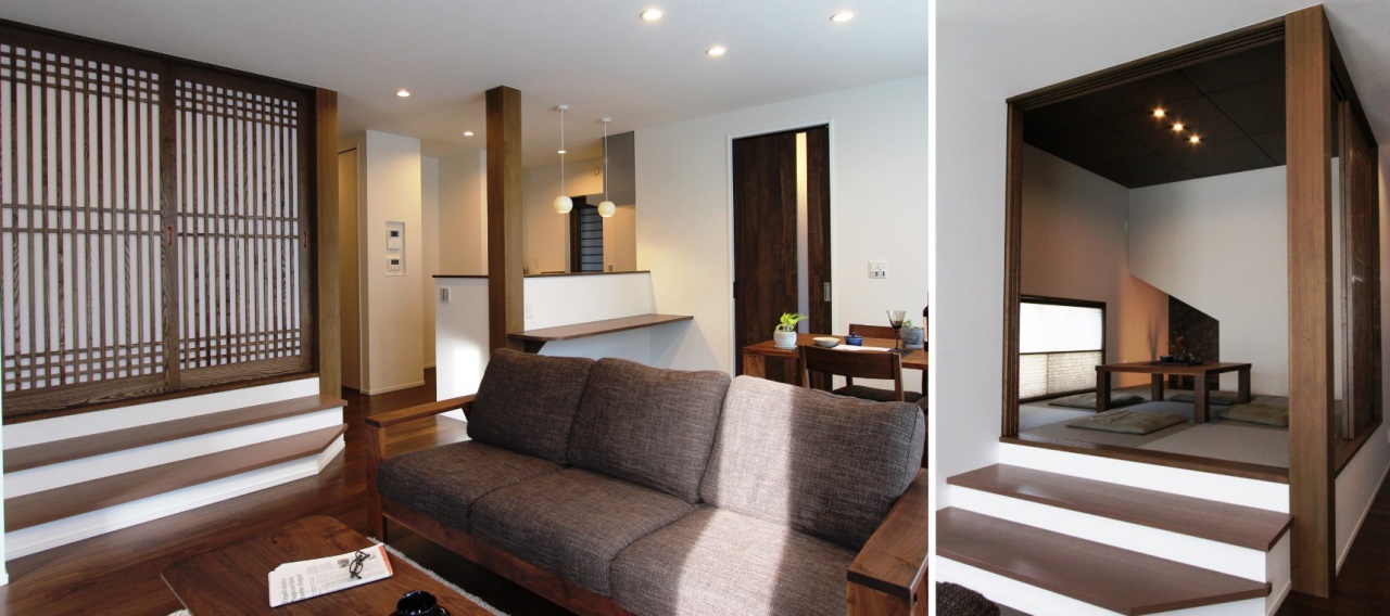 小上がりの畳スペースが、障子を閉めると独立の和室として使用できます。小上がり部分に収納を備え、リビングの片付けにも一役買っています。