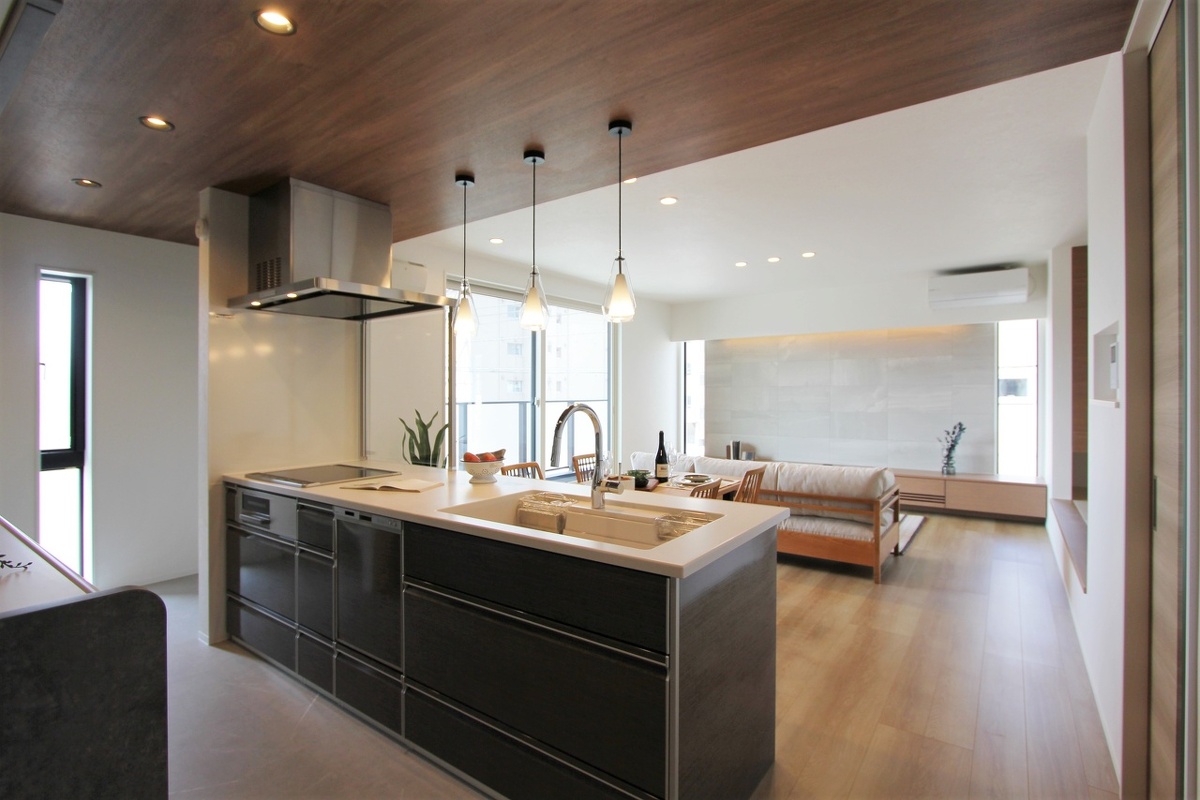 キッチンは天井を一段下げ、木目の素材で仕上げることで空間にあたたかみと落ち着きを演出。ほとんどの照明をダウンライトとし、空間をすっきりと見せつつ、キッチンにはデザイン性のあるペンダントライトを採用し、程よいアクセントとなっています。さらに、間接照明のやわらかな光が住まい全体に上質な雰囲気をもたらしています。