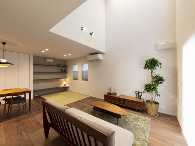 リビングの一角には、畳コーナーを設け、くつろぎや家族の団らんに最適なスペースに。さらに、畳コーナーにはコンパクトな書斎スペースと造作収納棚を備え、ワークスペースとしても、趣味のスペースとしても活用できます。