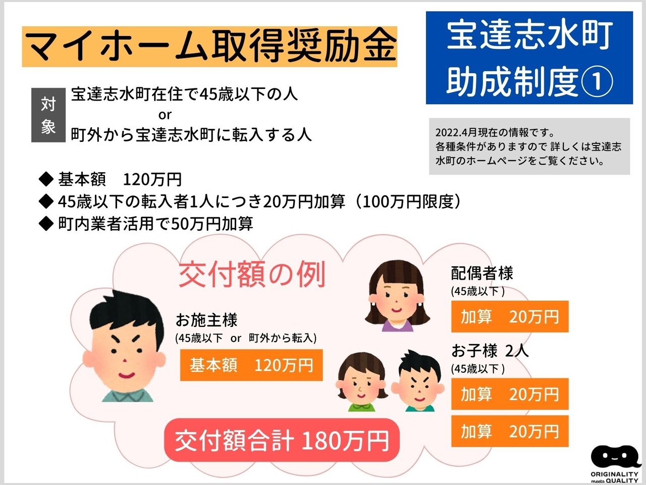 | マイホーム取得奨励金 | 宝達志水町在住で45歳以下の人 or 宝達志水町に転入する人 ・基本額 120万円 ・町内業者活用で50万円加算 ・45歳以下の転入者1人につき20万円加算 |