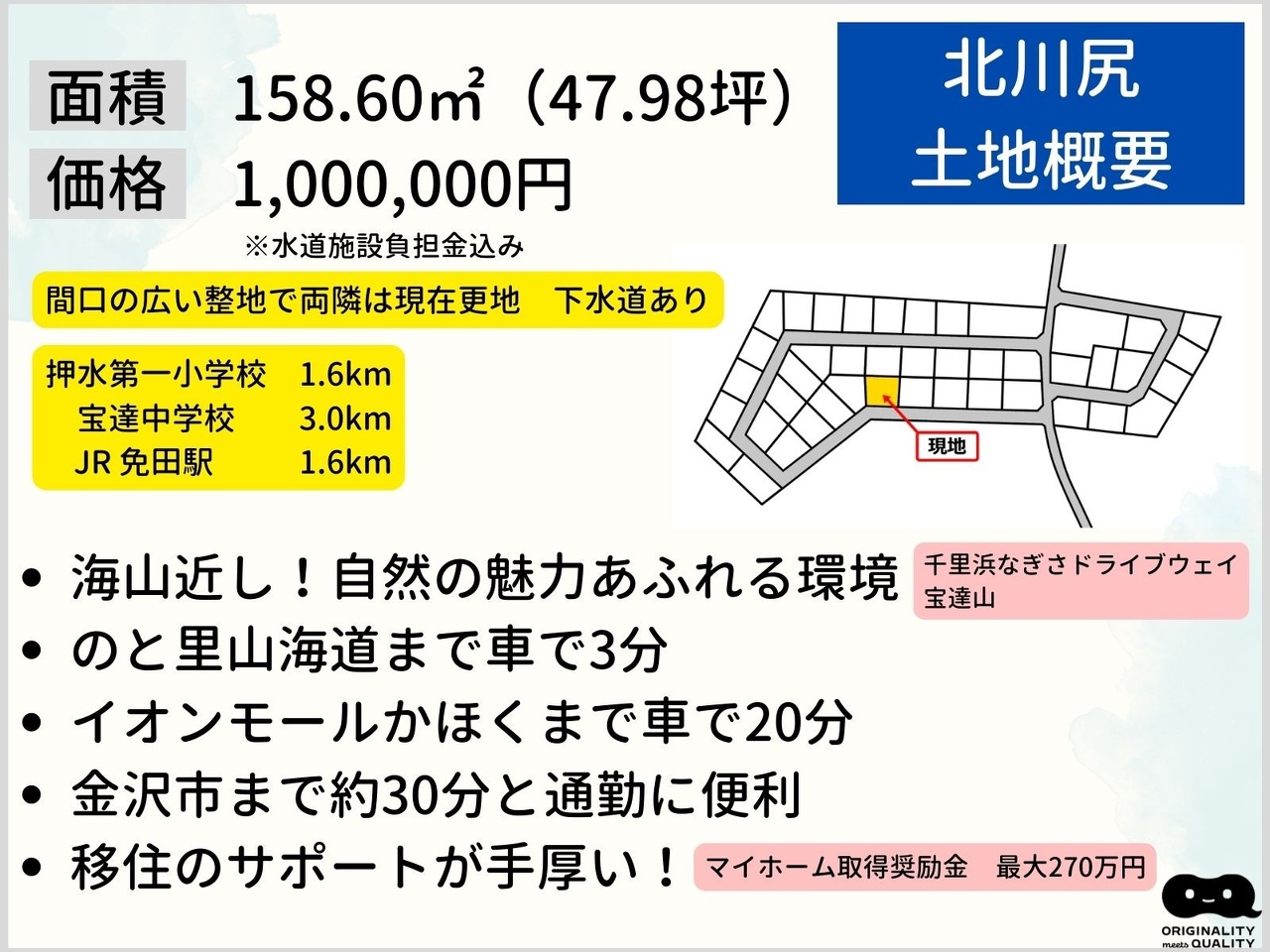 | 交通 | JR 宝達駅:自動車9分(3.4km) JR 免田駅:自動車4分(1.6km) コミュニティバス 北川尻バス停:徒歩14分(1.2km) のと里山海道 米出IC:自動車4分(1.3km) |